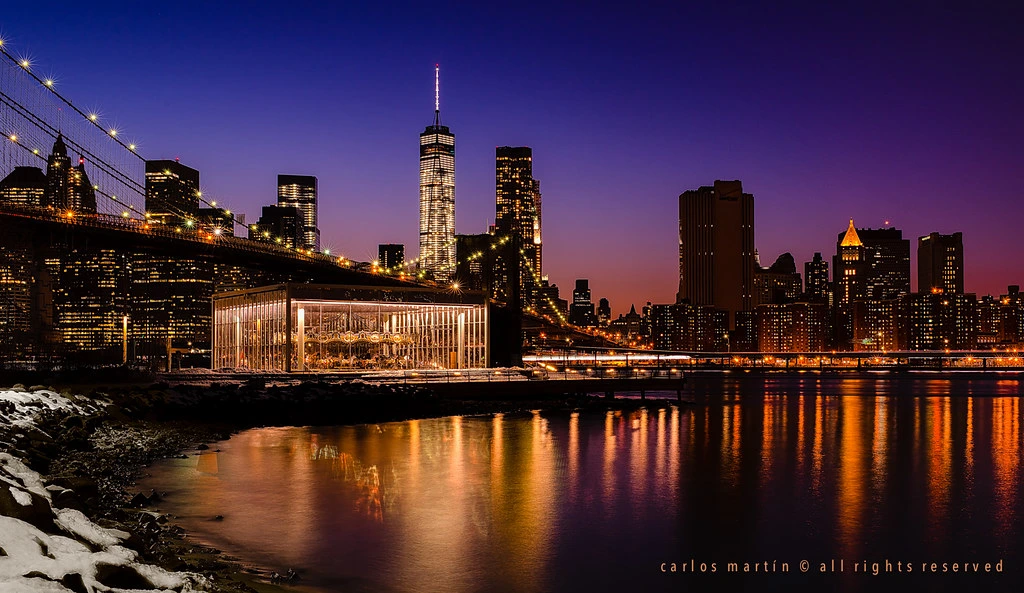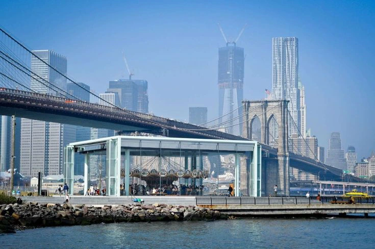 엉겁의 시간만큼은 아니더라도 긴 기다림 끝에 회전목마가 대중에게 공개되었을 때 한 가지 흥미로웠던 점은 회전목마를 둘러싸고 있는 박스 형태의 건물이었다. 회전목마를 감싸안고 있는 이 건물은 프리츠커 상 수상자인 프랑스 출신의 건축가 장 누벨에 의해 디자인되었다. 장 누벨은 우리나라에서도 리움 미술관 중 하나를 맡아 설계를 담당했던 것으로 잘 알려져 있다. 장 누벨은 놀이공원에서 마치 뛰쳐 나온 것처럼 보이는 형형 색색의 생동감 넘치는 말들을 차분하고 단순한 디자인의 박스에 담았다. 건물 자체 보다 회전목마에 눈길이 보다 더 갈 수 있도록 한 배려이면서도 기능적, 심미적 가치를 놓치지 않으려 하는 의도가 들어가 있다. 건물은 습기에 취약한 나무로 된 말들을 보호하기 위해 회전목마 전체를 감싸는 형태를 취하고 있고 여기에 유리와 스틸의 사용을 통해 커튼처럼 건물을 개폐하여 강변을 향한 탁 트인 개방감을 제공하였다. 낮에는 마치 서커스의 막이 오르듯 파사드를 커튼처럼 접어 가리지 않는 시야를 제공하고 밤에는 그 자체로 빛나는 박스가 되어 브루클린의 밤을 밝게 비춘다. 회전목마를 타고 있으면 맨해튼의 풍경이 한눈에 보였다가 금세 공원과 주변 건물로 이어진다. 순환하는 풍경의 연결 고리는 작은 공간임에도 불구하고 역설적으로 잠시나마 무한한 시간과 공간의 흐름을 느끼게 해준다.