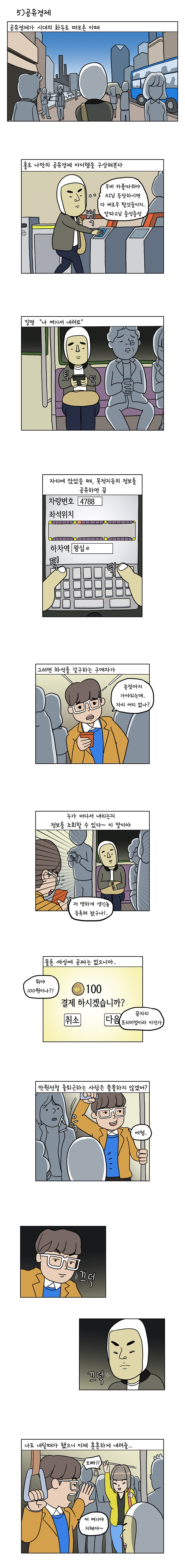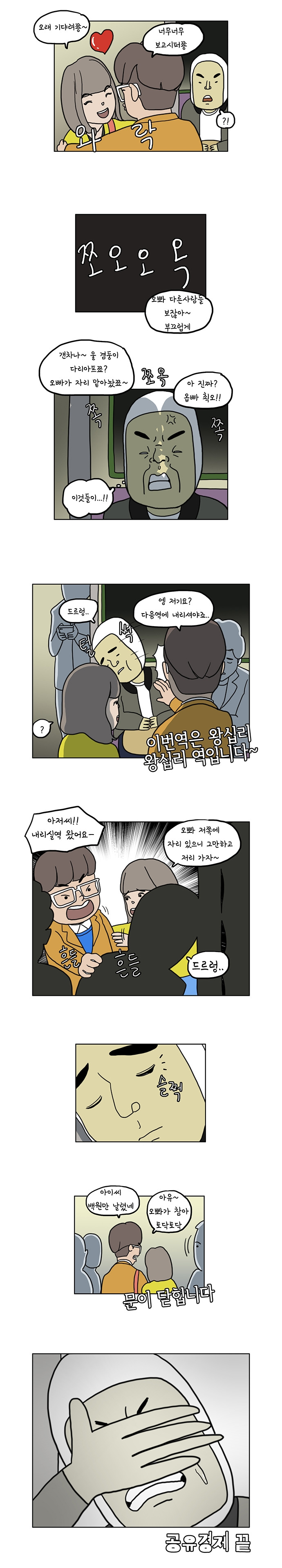 지하철 좌석을 선점해서 특정 인물에게 판다면 모르긴 몰라도 경찰서 가는 건 확실하지 싶다. 그렇다면 내가 어디서 내리는지의 정보만 돈 받고 공유하면 어떨까 해서 만든 만화이다. 몇 년 전 음주단속 정보도 제보를 받아 공유하는 앱이 생길 수도 있을 거 같다고 했을 때 옆에 듣던 친구는 코웃음을 쳤었다. 블랙박스와 일체형인 헬멧이 나올 것 같다 라고 했을 때도 바이크 헬멧에 고프로를 매달고 다니던 친구는 되겠냐며 비웃었다. 같은 친구다. 가만히 생각해보니 실현 가능성이 없어서 비웃은 게 아니라 내 말을 허투루 듣는 것은 아닐까? 꽤씸하네?!