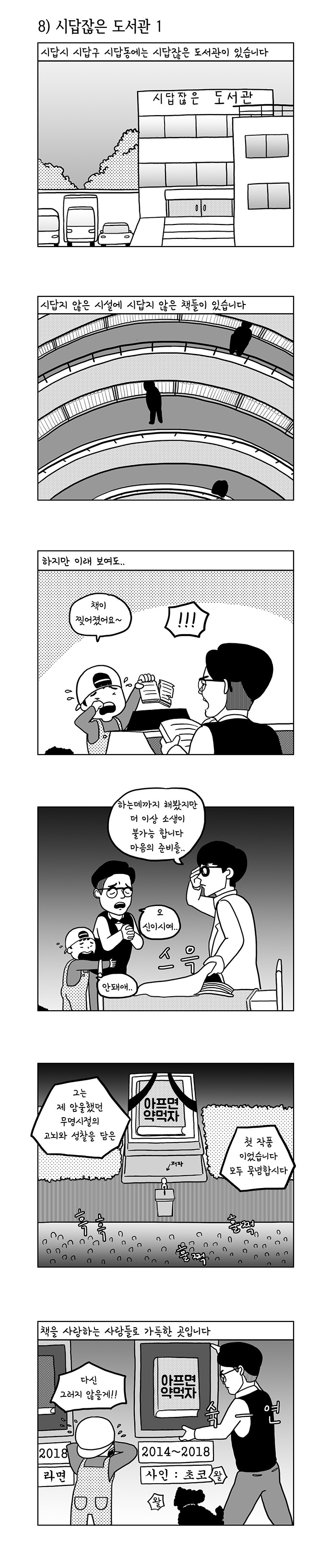 도서관에서 일한 지 얼마 되지 않았을 때, 작게 혹은 크게 훼손된 책을 보고 가슴이 아팠다. 훼손된 책을 모아서 한번씩 장례를 치르고 더 이상 보충하지 않으면 사람들은 책을 더 소중히 여기지 않을까 하는 생각을 했다. 그렇게 운영되는 도서관은 없겠지만, 나만의 방식으로 운영되는 도서관을 만화로 그려보기 시작한 것이 바로 이 <시답잖은 도서관> 시리즈이다. <천리마 마트>처럼 좀 더 다양한 아이디어로 긴텀으로 그려보고 싶었는데 몇 개 그리지 못한 것이 아쉽다. 하지만 아직 끝나진 않았다.