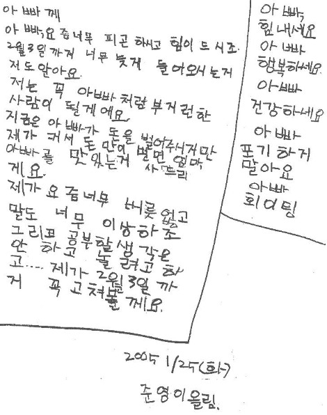 2005년 1월 25일(화요일)에 아들이 나에게 쓴 편지다. 2005년 1월이면 아들이 초등학교 1학년 겨울방학때다. 그럼 난 그 시간에 무슨 일을 하고 있었길래 이런 내용의 편지를 받았을까?