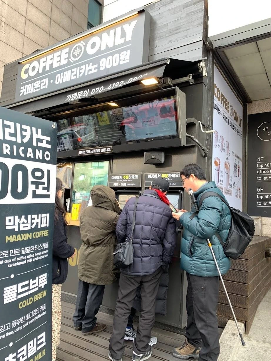 사진#1. 거리에서 커피를 전문으로 팔고 있는 가게 앞입니다. 특징적인 것은 주문을 위한 자판기가 두대 설치되어 있고 가게 주인은 자판기를 통해서만 주문을 받고 있는데요. 그 앞에선 고객들이 몇 분째 기기 앞에서 주문을 하고 있는 모습입니다. 이러한 주문을 위한 자판기는 과연 어떻게 디자인되어야 할까요? 누구의 가치를 높이는 것이 상점 주인에게도 고객에게도 도움이 되는 일일까요?