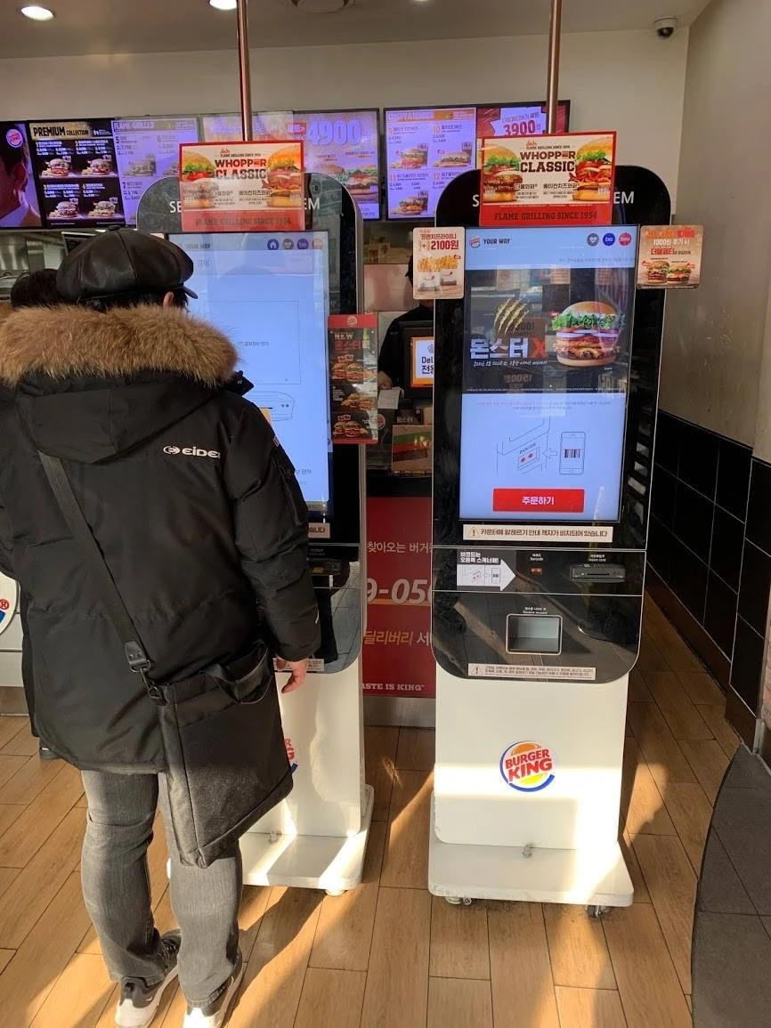 사진#2. 패스트푸드점에서 쉽게 발견할 수 있는 키오스크 자판기의 모습입니다. 이 점포의 경우는 키오스크만으로 주문을 받고 있었는데요. 대부분의 경우 주문에 시간을 들이고 있는 모습을 관찰할 수 있었습니다. 아마도 인건비 감소의 측면이 고려된 것이 아닌가 하는 생각이 드는데요. 고객 순환율의 관점에서 생각해 본다면 과연 대인 주문방식 대비 어떠한 드라마틱한 효과가 있을까요? 키오스크 사용이 어려운 소외층은 어떤 생각을 할까요?