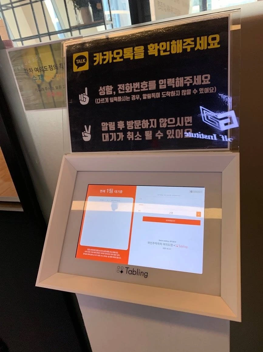 사진#4. 손님이 붐비는 식당 앞에 설치되어 있는 자동 순서 번호표 등록기입니다. 카카오톡을 이용해 순서가 되면 불러주는 기기인데요. 대기 손님을 관리하는 점원의 역할이나 숫자를 줄일 수 있는 기기로 생각됩니다. 고객의 관점에서 본다면 과거의 대기 관리 방식에 비해 어떤 점들이 나아졌을까요?