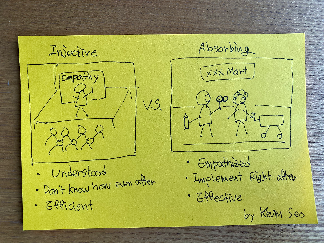 <그림#1>에서 보시는 바와 같이 강의실 안에서 사람들을 모아놓고 디자인 싱킹의 이론과 사례들을 학습하는 주입식 교육 방식은 시간, 비용 효율적이고, 디자인 싱킹을 이해하는 데 도움은 됩니다만, 기존의 다른 교육들과 마찬가지로 교육을 들었다고 해서 디자인 싱킹을 현업에서 바로 수행하지는 못합니다. 이와는 다르게 디자인 싱킹의 학습과정에서 현장에서 진행되는 흡수식, 체험식 디자인 싱킹 교육은 이론이나 정의에 대해 이해하는 것은 부족할지 모르나, 현업에서 바로 적용할 수 있는 장점을 가지고 있습니다. 시간과 비용 측면에서 효율적이지 못한 것도 단점이겠네요. 하지만, 디자인 싱킹 교육의 사상(공감과 이를 기반으로 한 창의)을 떠올려보면 주입식과 흡수식의 교육 중 어떤 것이 더 디자인 싱킹 교육으로 적합한지 판단하실 수 있으리라 생각됩니다. 교육생들에게 디자인 싱킹을 이해시키겠습니까? 아니며 디자인 싱킹을 공감하도록 하겠습니까?