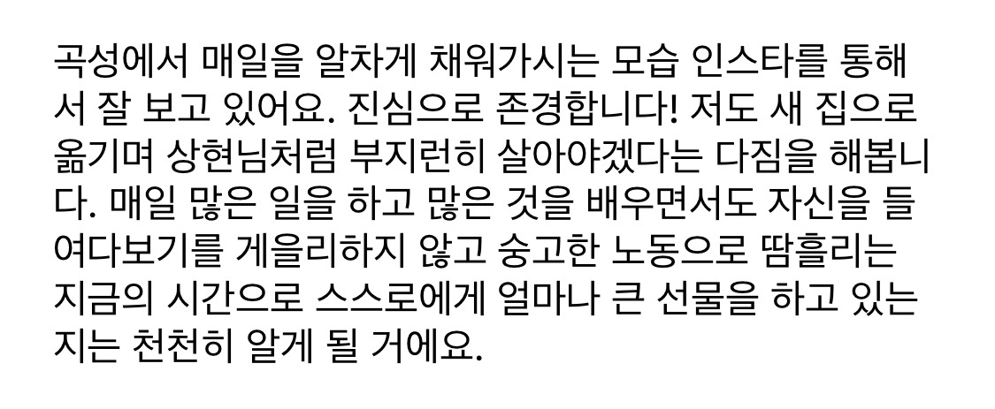 아주 고운 면포로 덩어리를 걸러내는 것처럼, 어떤 경험을 한 문장으로 나타낸다는 것은 거르고 걸러야지만 나오는 정수라고 생각하기에 종종 사람들에게 묻는다. “당신이 가진 그 경험을 한 문장으로 표현한다면 어떻게 하시겠어요?”. 곡성에서의 삶에 대해 이 질문을 던졌고 이런 대답이 나왔다. “인생의 희로애락이 담긴”. 살면서 느껴보지 못한 수많은 감정들을 느낀 시공간이었다. 곡성에 가게 된 계기부터 입사하고, 내외적으로 갈등을 겪고, 퇴사를 결심하고, 이모할머니가 돌아가시고, 친한 친구가 큰 병을 앓고, 자전거 사고가 나서 식물인간이 될 뻔하고, 멀리서 친구들이 찾아와 주고, 다시 새로운 시작을 준비하고, 수많은 친구들이 하늘의 별이 되고, 대입이라는 새로운 꿈을 품고 떠난 공간.