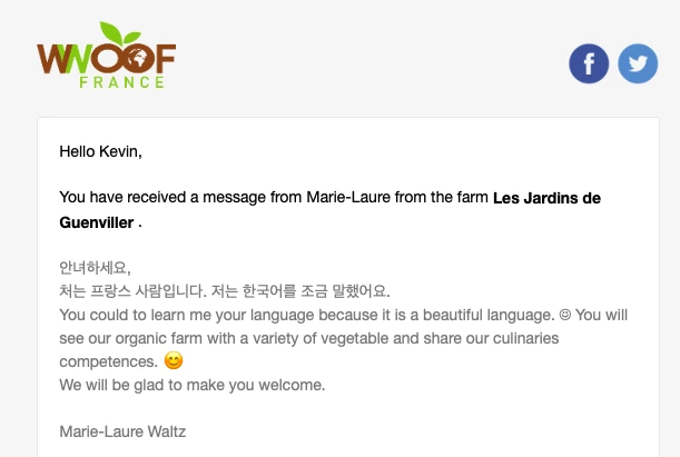 그 내용은 '안녕하세요, 처는 프랑스 사람입니다. 저는 한국어를 조금 말했어요’로 시작해, 한국 문화에 관심이 많고, 자기 아버지의 농장에 오고 싶으면 환영한다고 메일을 보내왔다.