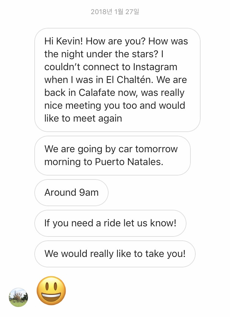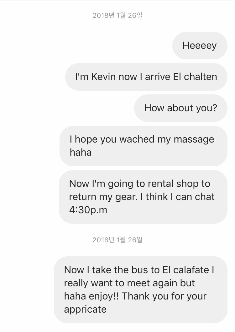 다음날 아침 버스표를 예매하기 위해 카페로 가서 , 인터넷을 켜니 벤에게서 문자가 온 것이다. "어제 인터넷이 안돼서 답장을 못해, 너무 미안해. 그리고 오늘 10시에 엘 칼라파테 갈 건데 네가 가면 우리가 꼭 태워주고 싶으니 그전에 문자 줘!"