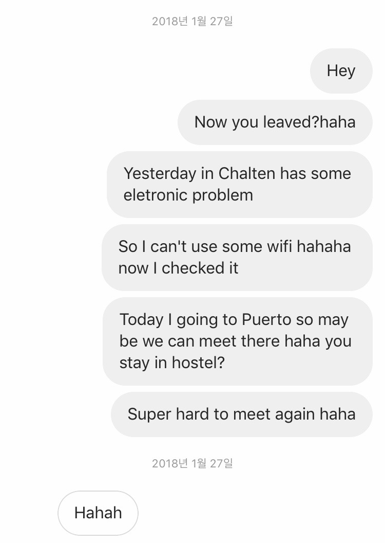 당시 피츠로이 전망대까지 올라가는 길이였는데 뒤에서 한 커플이 빠른 속도로 따라오길래 내가 느린가 싶어서 그들에게 “먼저 갈래요?”라고 물었는데 괜찮다고 걱정하지 말라고 했다. 이야기하는 걸 들어보니 독일어 발음이랑 정말 비슷한 것 같아서 독일에서 왔는지 물어봤다..