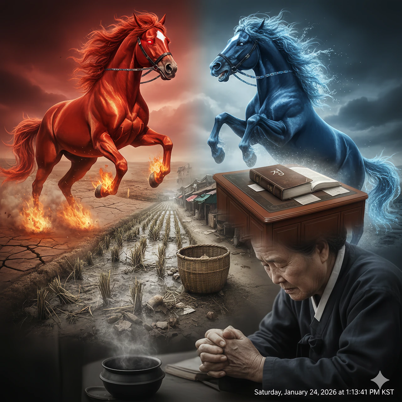 타는 속붉은 말 달리면푸른 말이 고삐를 잡고푸른 말 오르면붉은 말이 이빨을 세운다싸움이 커질수록논밭은 더 밟히고장바구니는 가벼워진다정의는 책상 위에서 돌고시장 골목엔 한숨만 길다끝내속만 타는 건이 땅의 밥 짓는 사람들