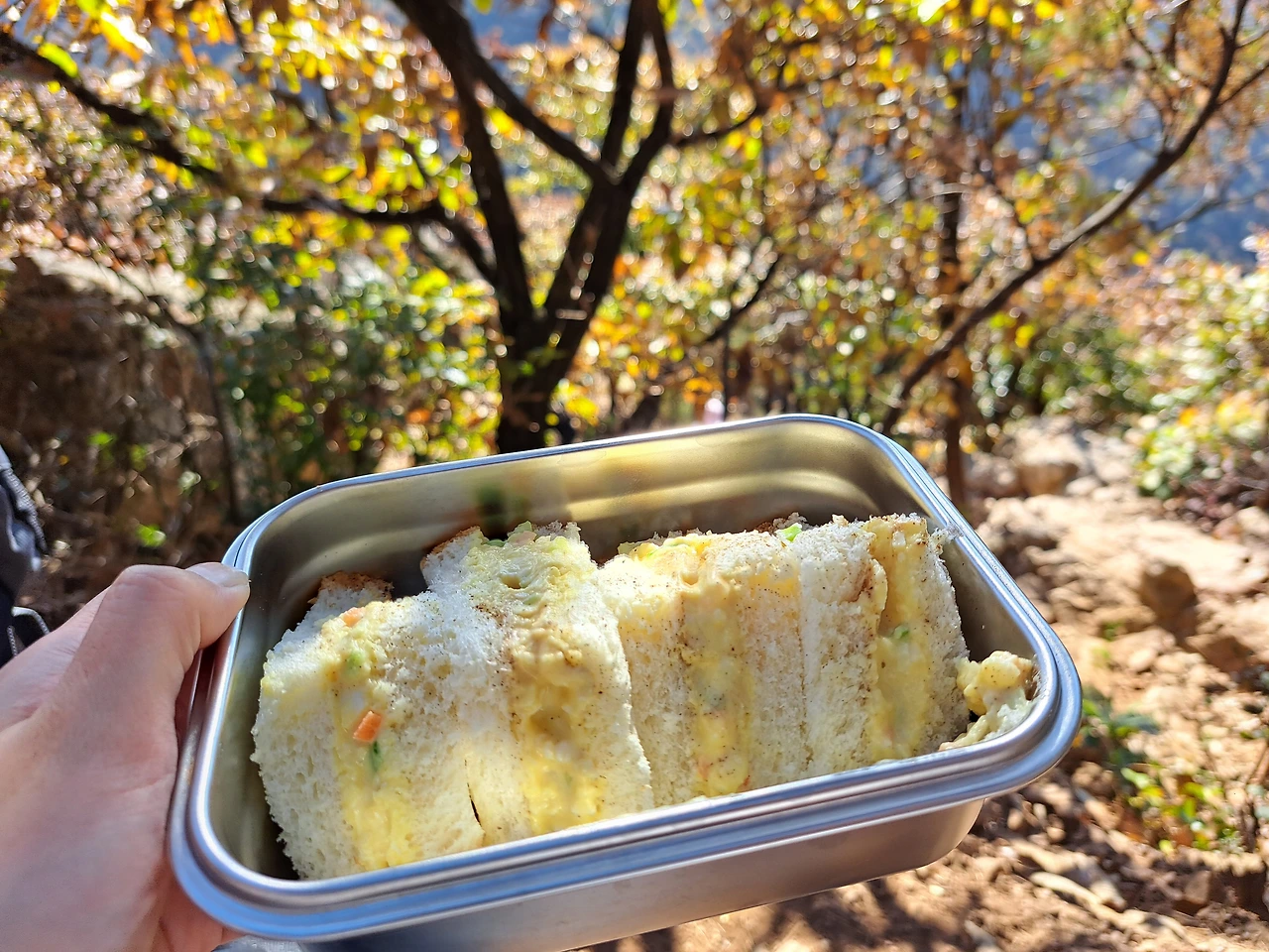 이런저런 생각을 하다 보니 수암봉 정산에 다다랐다. 며칠 고민한 끝에 내가 싸 온 도시락은 계란 샌드위치와 녹차였다. 준비하는 과정은 이랬다. 등산 전날 영양 가득한 계란 몇 개를 미리 삶았다. 다 삶은 계란을 보울에 넣고 포크로 적당히 포슬거릴 때까지 으깼다. 그리고 등산 가기 30분 전에 으깬 계란에 설탕, 소금, 후추, 레몬즙을 가볍게 섞어 식빵에 발라 가져갔다. 꽤 정성스럽지만 그 과정이 대단히 어렵지는 않아서 나도 부담 없이 준비할 수 있었다. 혹시 목이 막힐까 봐 따듯한 녹찻물도 준비했다. 그런데 친구가 전날 커피를 너무 많이 마셨다며 녹차는 마시지 않고 샌드위치만 감사히 먹겠다고 했다. 솔직히 기분이 나쁘지 않았다. 전날 업무를 하느라 무리한 친구에게 억지로 권하고 싶지 않았고, 친구의 반응에 엄청난 기대를 한 것도 아니어서 크게 상관이 없었다.