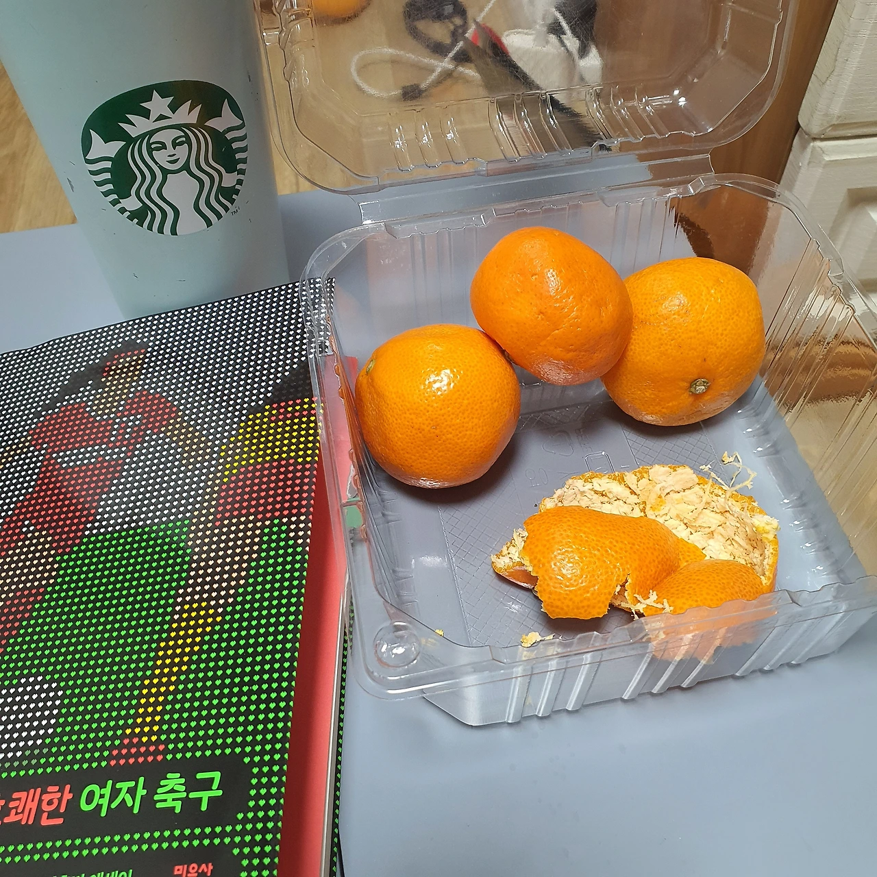오늘도 바싹 마른 목 때문에 일어났더니 오전 9시. 씻고 요구르트랑 딸기를 먹었다. 어제 엄마한테 부탁해 쟁여놓은 귤이 참 맛있다. 아침엔 정신 못 차릴 정도로 졸리고 열이 나서 줄곧 침대에 누워있었다.