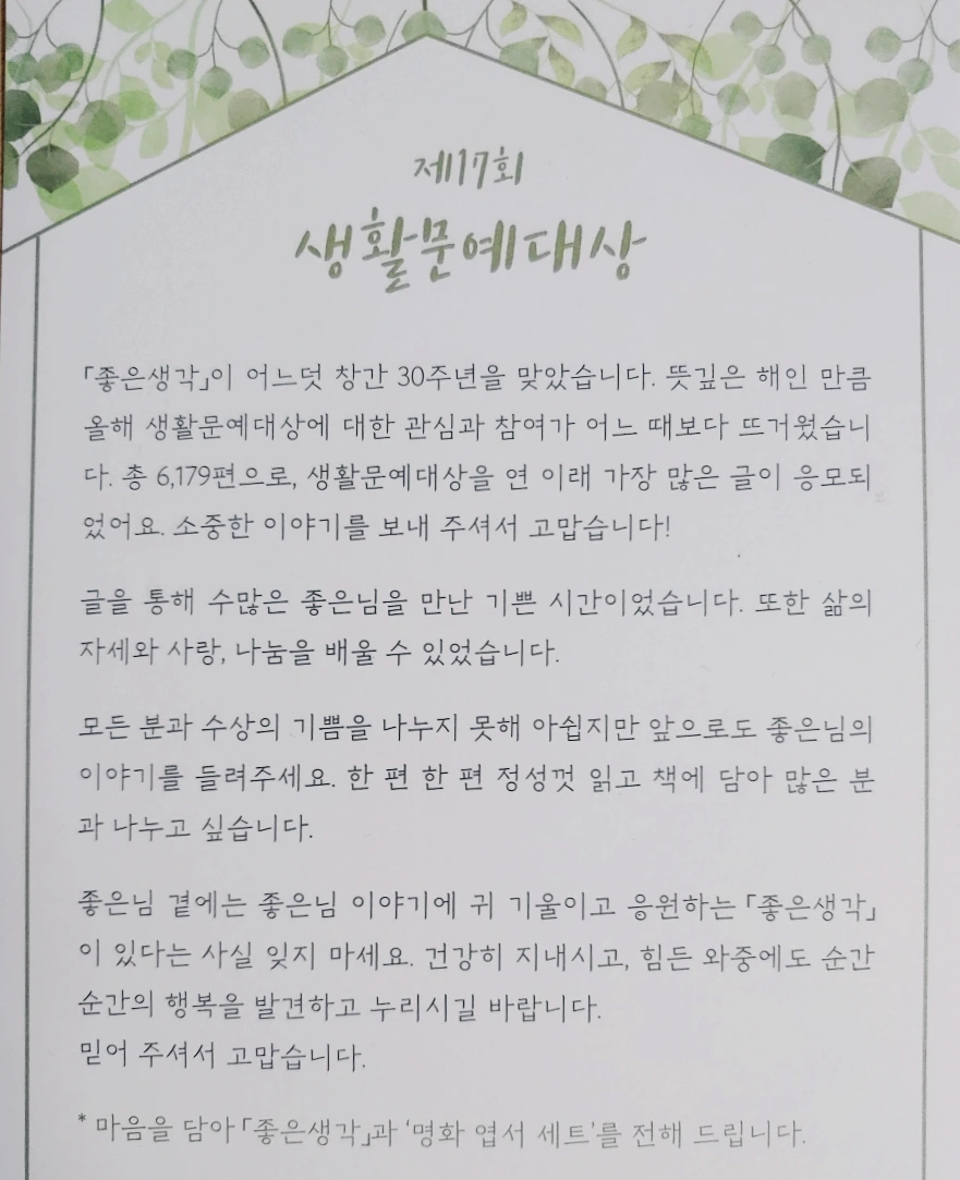 내가 지금껏 두려워하며 피해오던 건 뭐였을까. 나 혼자 쓰고 보는 글은 온전한 글이라 할 수 있을까? 꼬리를 무는 질문 끝에 나는 생각을 멈추고 도전해보기로 했다. 그 벽에 직접 부딪혀보고 어떤 일이 일어나는지 보고 싶었다. 그래서 마감이 얼마 남지 않았던 생활문예대상에 글을 던져두고 기다렸다.