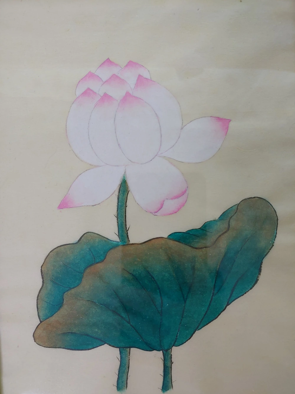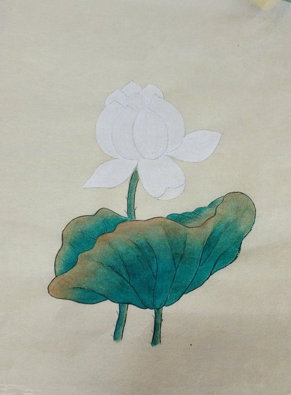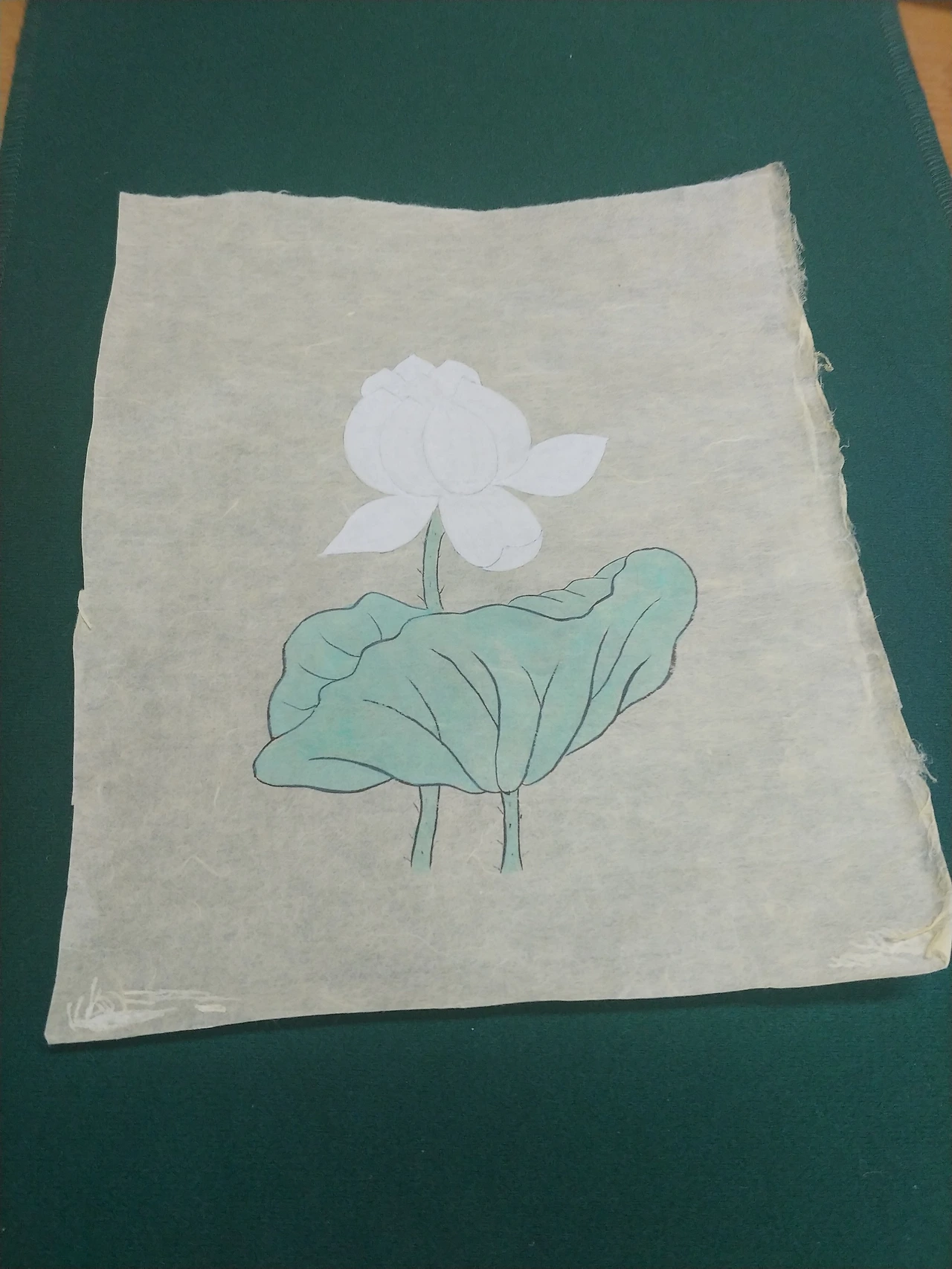 선을 다 긋고 나서는 바로 채색에 들어갔다. 민화의 경우 한 번 색을 올리는 것으로 끝나는 게 아니었다. 아래 사진의 꽃의 경우에도 그냥 흰색으로 칠한 것처럼 보이지만 호분을 두세 번 올린 상태다. 연잎은 연꽃보다 훨씬 많은 색을 올렸다. 연한 백록색을 올리고, 청색을 점점 짙게 만들어서 차례대로 올리기 시작했다. 그다음에는 역방향으로 갈색이 섞인 녹색을 두어 번 올렸다.