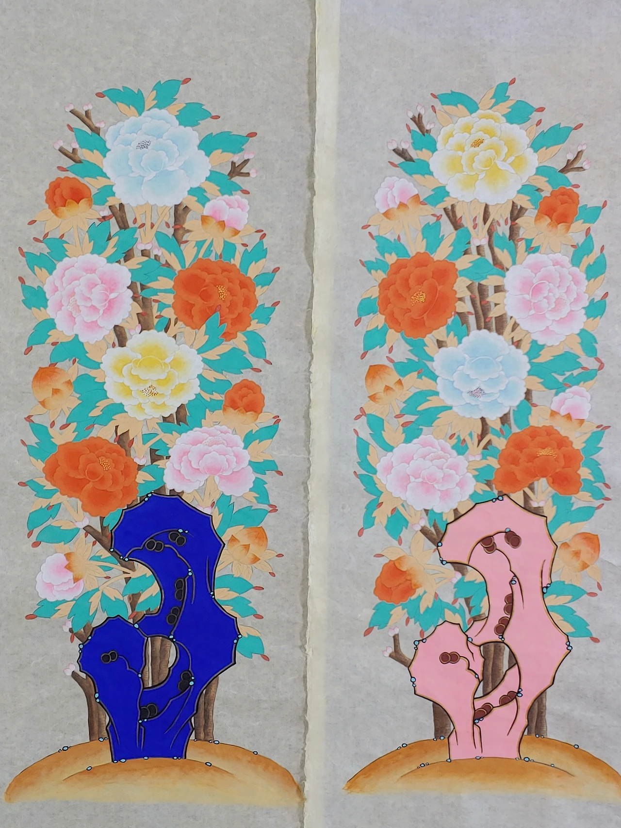궁모란도는 특이하게도 두 그림이 한 쌍이 되는 대형 작품이다. 같은 그림을 두 번 그리면 되는 것이니 오히려 편하지 않느냐고 할 수도 있지만, 한 작품을 끝내고 다른 작품을 들어가는 방식이 아닌 동시에 진행되어야 하는 작품이라 만만치 않다.