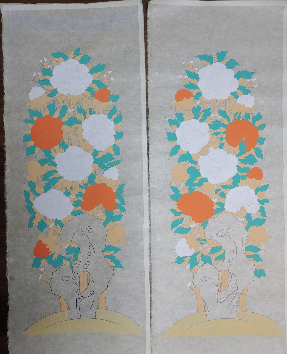 이 두 그림을 나란히 놓았을 때 꽃과 나뭇가지의 색이 달라서는 안 되기 때문에 물감을 한 번에 만들어서 진행한다. 중간에 물감이 부족해 추가해서 섞으면 색이 바뀌기 때문에 처음 만들 때 넉넉하게 만들어야 했다. 이런 이유 때문에 같은 부분을 다른 날에 칠하기도 애매해졌다. 물감을 굳혔다가 일주일 뒤에 물을 섞으면 색이 달라질 수밖에 없기 때문이다.