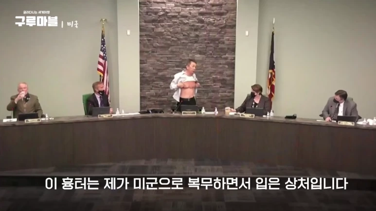 와이셔츠를 그대로 들어 올려 전쟁이 자신의 몸에 새겨놓은 흔적을 보여줍니다.