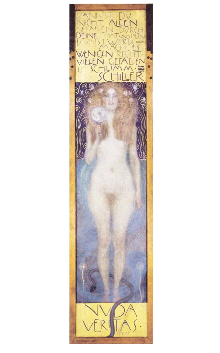 천장화 스캔들이 있기 조금 전에 완성된 〈누다 베리타스〉에서 클림트는 기존의 권위와 체제에 도전하겠다는 의지를 다시 한 번 표명한다....긴 머리를 늘어뜨린 나체의 여인이 냉정한 표정으로 똑바로 선 채 거울을 들고 있다. 약간 벌어진 입술, 피 흘리는 상처 같은 뺨의 홍조, 투명한 눈동자 등으로 인해 이 벌거벗은 여성은 보는 이들에게 섬뜩한 느낌을 준다. 그녀의 발치에는 검은 뱀 하나가 막 똬리를 틀며 올라오고 있다. 그리고 그 밑으로 ‘누다 베리타스’, 즉 ‘벌거벗은 진실’이라는 그림 제목이 선명하게 새겨져 있고 여인의 머리 위로는 “모든 이를 즐겁게 할 수 없다면 차라리 소수를 만족시키는 길을 택하라”는 프리드리히 실러Friedrich Schiller의 시구가 황금빛으로 빛나고 있다. 이 도드라진 문장은 보수적인 빈 사회에 던지는 클림트의 선전포고처럼 들린다.