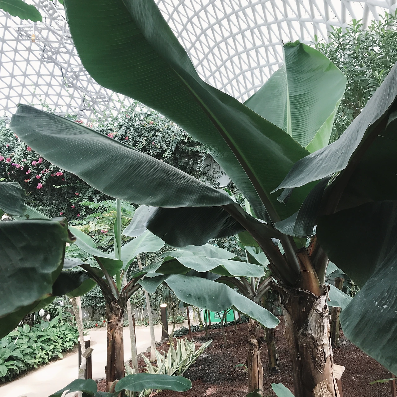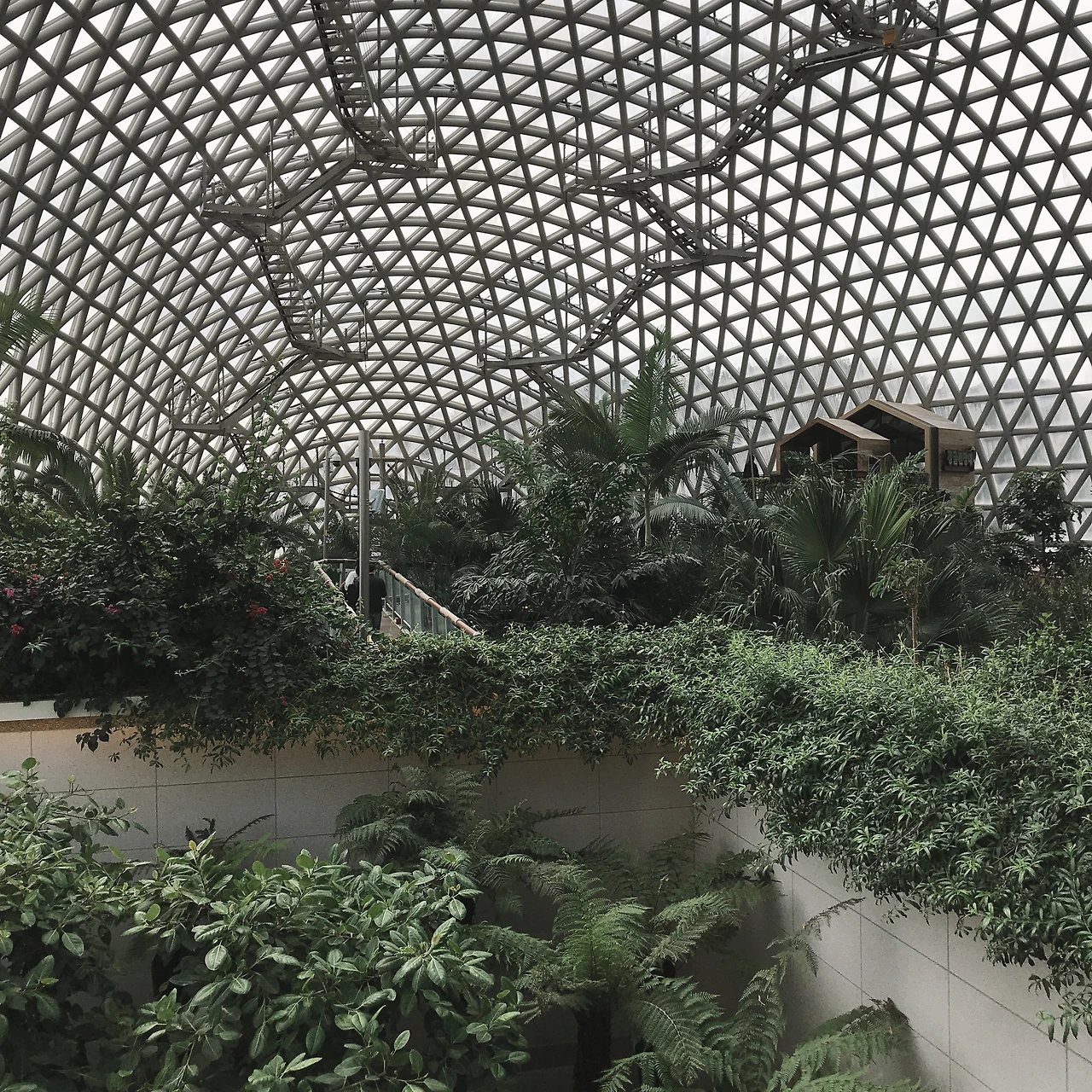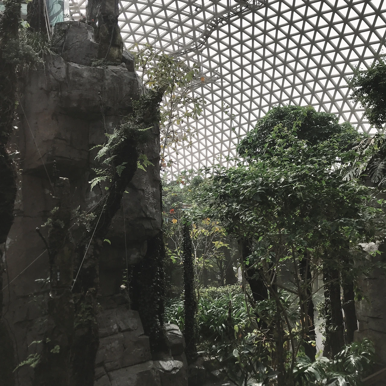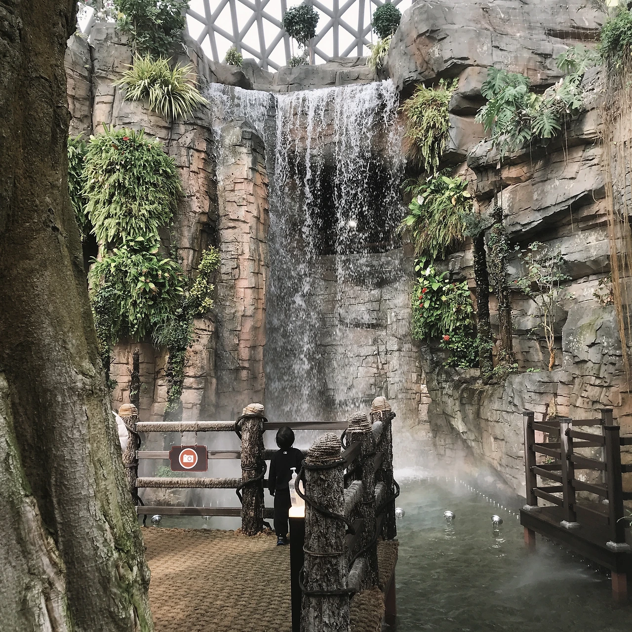 돔 안으로 들어서는 순간 습기와 온기가 훅 다가왔다. 관람 방향이라고 적혀 있는 안내 푯말을 따라서 천천히 둘러보았다. 계단을 올라 아래를 내려다보았을 때, 정말 정글숲에 온 것 같은 기분이 들었다. 인공폭포는 시원한 소리를 내며 떨어지고 있었고, 새소리가 스피커를 통해서 흘러나오고 있었다. 은은히 올라오는 물안개가 열대 식물을 감싸고 지나가는 모습에 마치 영화 속 어느 장면에 들어와 있는 것 같은 착각이 들었다. 곳곳에 이름표가 부착된 열대 식물은 충분히 눈요기가 되었다. 요즘 실내에서 쉽게 볼 수 있는 스킨답서스와 안스리움이 구석구석 바닥에 깔려 있고, 그 틈 속으로 보리수 같은 나무들이 서 있었다. 이 모든 것을 다 둘러보는데 약 3~40분이면 충분했다.