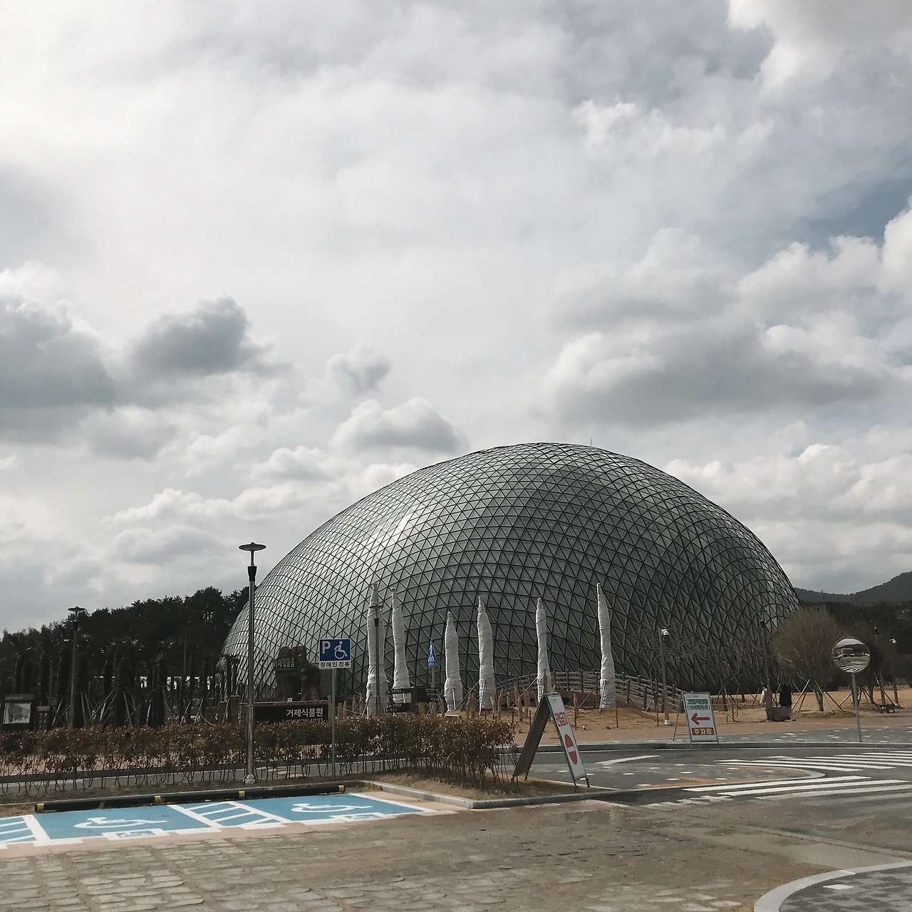 ‘섬꽃 축제’로 유명한 거제 남부면의 작은 마을에 마치 UFO가 하늘에서 떨어져 착륙한 듯 유리돔이 햇빛에 반짝이고 있었다. 높은 건물이라고는 눈을 씻고 찾아봐도 하나 없는 시골인지라 <거제식물원>의 존재는 그야말로 기이함을 뿜어내고 있었다. 주차장은 넓고 깔끔했다. 지난 2월 26일, 평일 오전. 사람들은 많지 않았다. 바람이 조금 세게 불었고, 식물원 입구로 들어가는 길 양 옆에 서있던 야자수의 온몸이 흔들렸다.