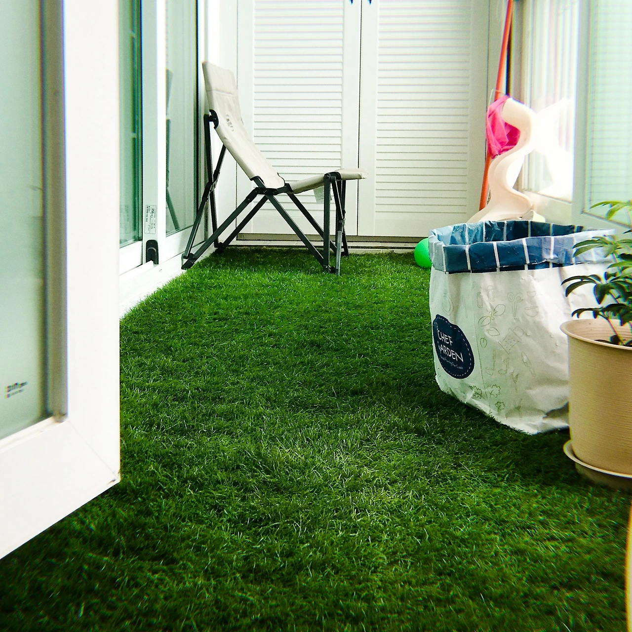 베란다에 쌓여 있던 짐을 털고 인조 잔디를 깔았다. 최근에 아이가 공 던지기를 시작했다. 이곳에서 작게나마 캐치볼을 할 수 있도록 장비도 마련했다. 작은 풀장을 마련해서 거실에 놓여 있는 미끄럼틀을 연결해서 물놀이도 즐길 수 있도록 할 예정이다. 아들이 좋아해 줬으면 좋겠다.
