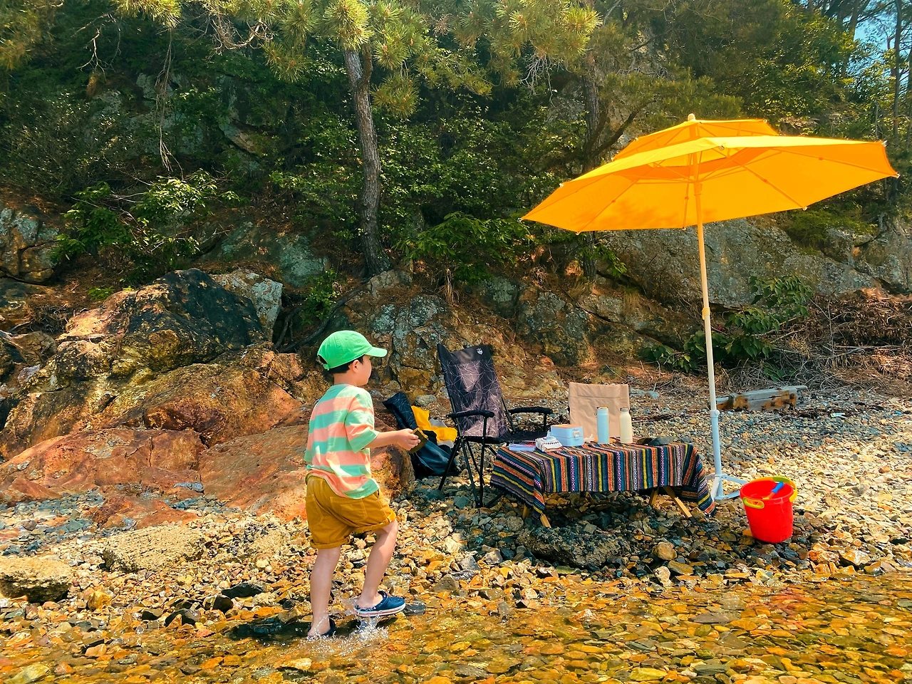 우리가 헤밍웨이라고 부르는 이 바닷가는 사람들이 별로 없다. 그래서 즐겨 찾는다. 아들은 크록스 안에 모래가 들어가는 것이 싫다며 한사코 돌멩이가 있는 바닷가에 가자고 한다. 그곳에는 이쁜 여자 게도 있어 좋다고 한다. 한 두세 시간 돌멩이를 들춰내면서 슬금슬금 기어 다니는 게를 잡아 바닷물과 돌멩이를 넣은 통에 담는 것이 이곳에서의 보통의 일과다. 이 날은 뜰채도 가져가서 바위에 붙은 물고기 두 마리와 작은 새우 하나를 잡을 수 있어서 더욱 신이 났다.