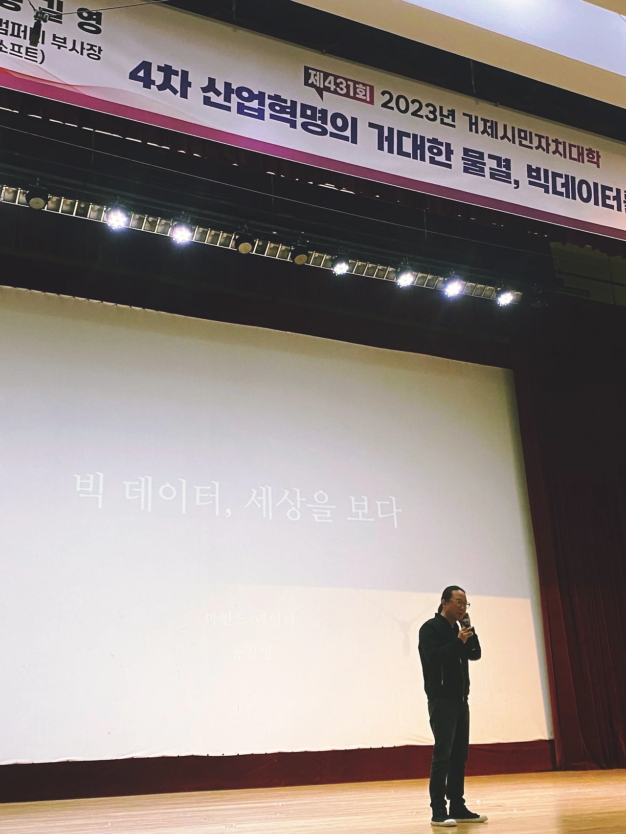 송길영 부사장의 트레이드마크는 검은 뿔테 안경인데, 오늘 강연에서는 그것을 쓰지 않았다. 어색했다. 그러나 특유의 툭툭 튀는 빠른 목소리에 금방 익숙해졌다. 200여명이 모인 강당에 서서 그는 거제도에 처음 온 것이라고 밝혔다. 동시에 거제도에 오게 된 이유도 그와 같다고 했다. 한 번 가봐야겠구나. 끌리면 가는 여유. 낯선 여행을 즐기는 삶. 늙음은 새로운 것을 받아들이고 배우는 것을 싫어하는 것이라고 하는데… 그는 여전히 젊구나. 낮 강연이니 끝나고 어디 근사한 곳에서 회라도 먹으면 좋겠구나 하는 생각을 했을 수도 있겠구나. 빅데이터 전문가답게 어쩌면 익숙한 강의 준비 보다 거제도의 주요 관광지 혹은 맛집을 수집하고 분석하는 데 더 많은 시간을 쏟았을지도 모른다.
