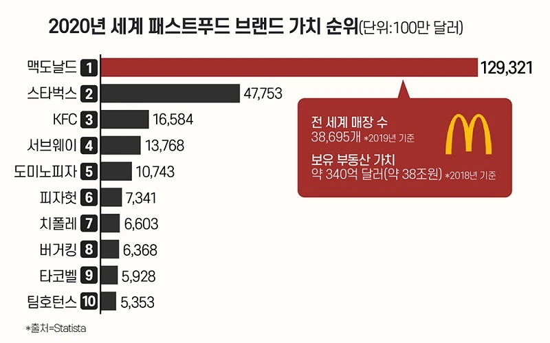 그리고 놀라운 점은 맥도날드는 세계 최대 부동산 회사라는 것이다. 맥도날드의 매출 중에 점포 운영으로 인한 매출은 절반도 되지 않는다. 22년 매출 230억달러 중에 부동산 임대 수익(90억 달러)과 로열티 수수료(50억 달러)가 절반이 넘는다. 매장 운영에 대한 전반적인 책임은 점주가 지고, 매장 부지 매입으로 인한 임대 수익과 로열티 수수료로 회사가 굴러가고 있다. 대단하다.