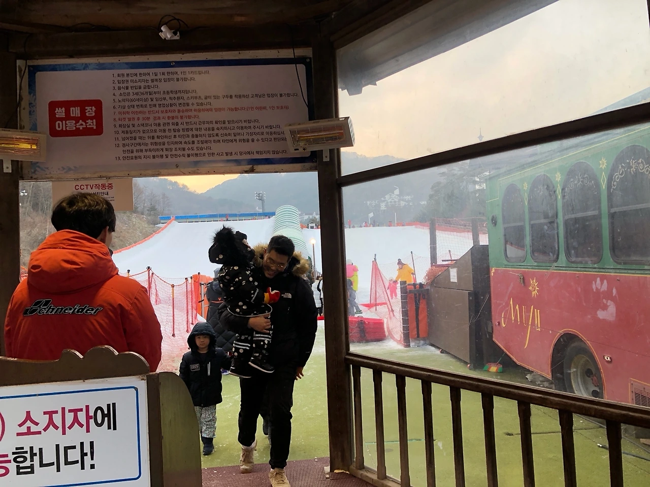 짐을 풀고 아들의 방한복을 입히는데 아주 힘들었다. 어색한지 계속해서 입기를 거부하며 바닥에 드러눕고 울었다. 달래고 달래 겨우 나왔더니 오후 4시. 썰매를 탈 수 있는 시간은 한 시간밖에 남지 않았다. 어차피 추위에 오랫동안 밖에 있으면 아들이 감기에라도 들지 않을까 하는 생각이 들어서 제값을 치르고 잠시라도 눈썰매를 타기로 했다. 하지만, 아내가 지갑을 두고 왔고, 등에 땀일 날 정도로 숙소로 다시 뛰어갔다 돌아와 낮은 눈썰매 슬로프에 올라서니 운영시간이 30분밖에 남지 않았다는 장내 방송이 울러 퍼진다. 어차피 오래 못 탈 것은 알았지만, 왠지 억울한 기분이 들었다.