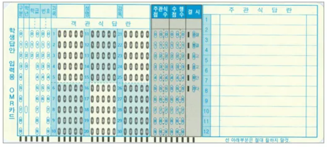 우리에게 매우 익숙한 OMR 카드 (광학 마크 인식, Optical Mark Recognition)가 기억나는가? 시험 볼 때 사인펜으로 칠해서 제출했던 기억이 있다면 그 카드를 말한다. OMR 카드는 최초의 컴퓨터 파일이다. 빠른 속도로 다량의 답안지를 채첨 하고 처리할 수 있다.