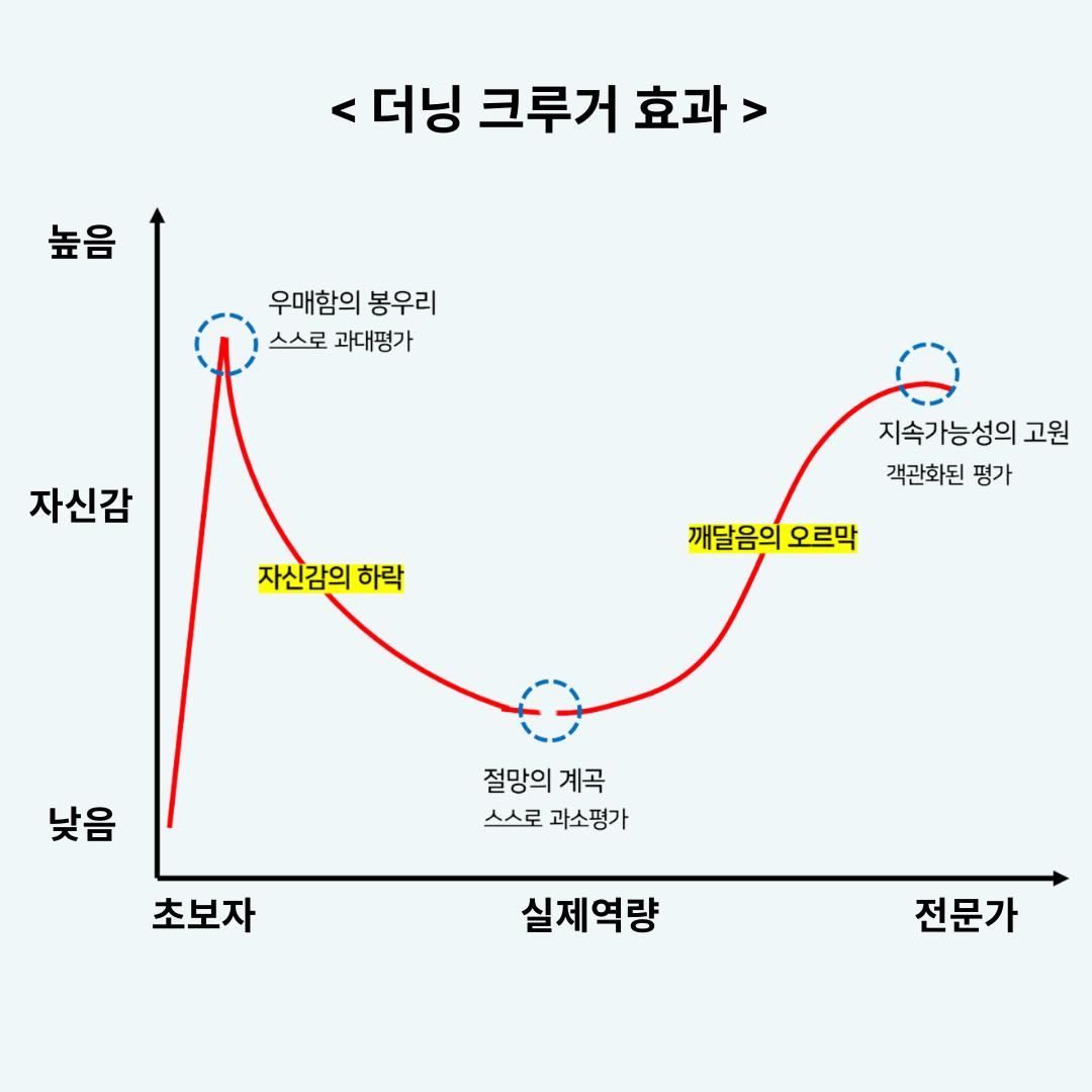 자신의 능력을 과대평가 --> 다른 사람의 진정한 능력을 알아보지 못함 --> 자신의 능력부족으로 생긴 곤경을 알아보지 못함 --> 훈련을 통해 능력이 나아지고 난 후에 이전 능력 부족을 알아보고 인정한다.