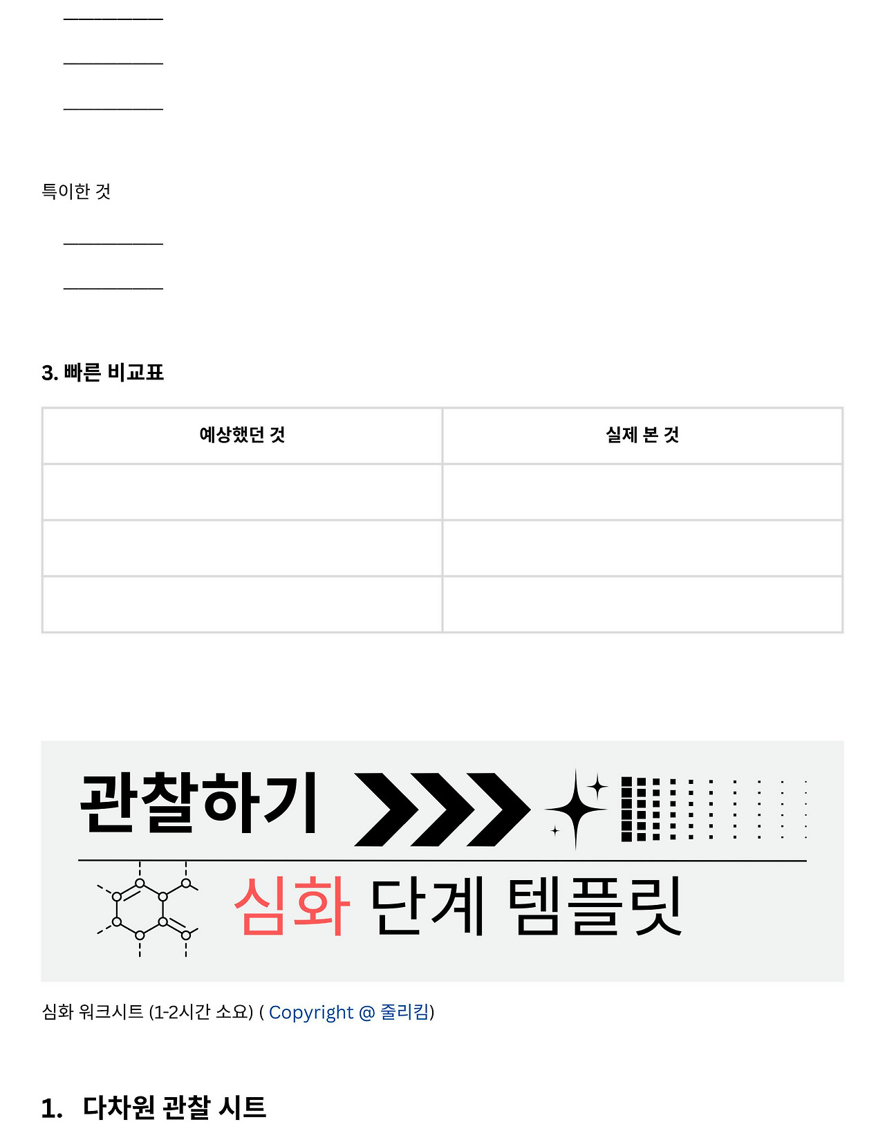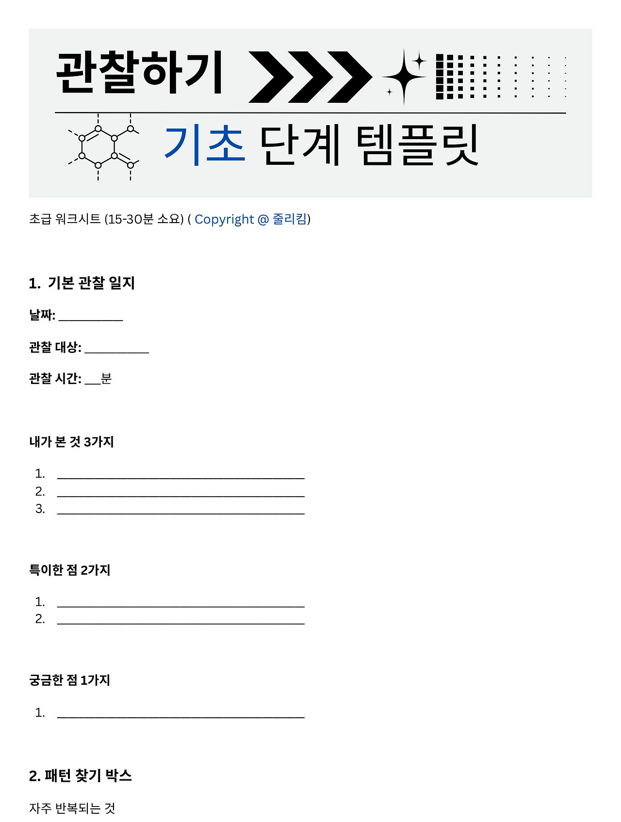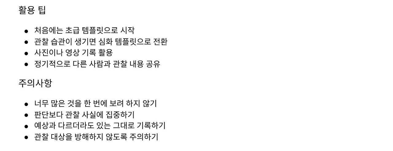 여기까지 읽었다면 지금쯤 '관찰이 쉬운 게 아니구나!'라고 여길 것이다. 그래서 준비했다. 관찰의 힘을 기를 수 있는 템플릿을 만들었다. 기초 단계와 심화단계로 나누었다.