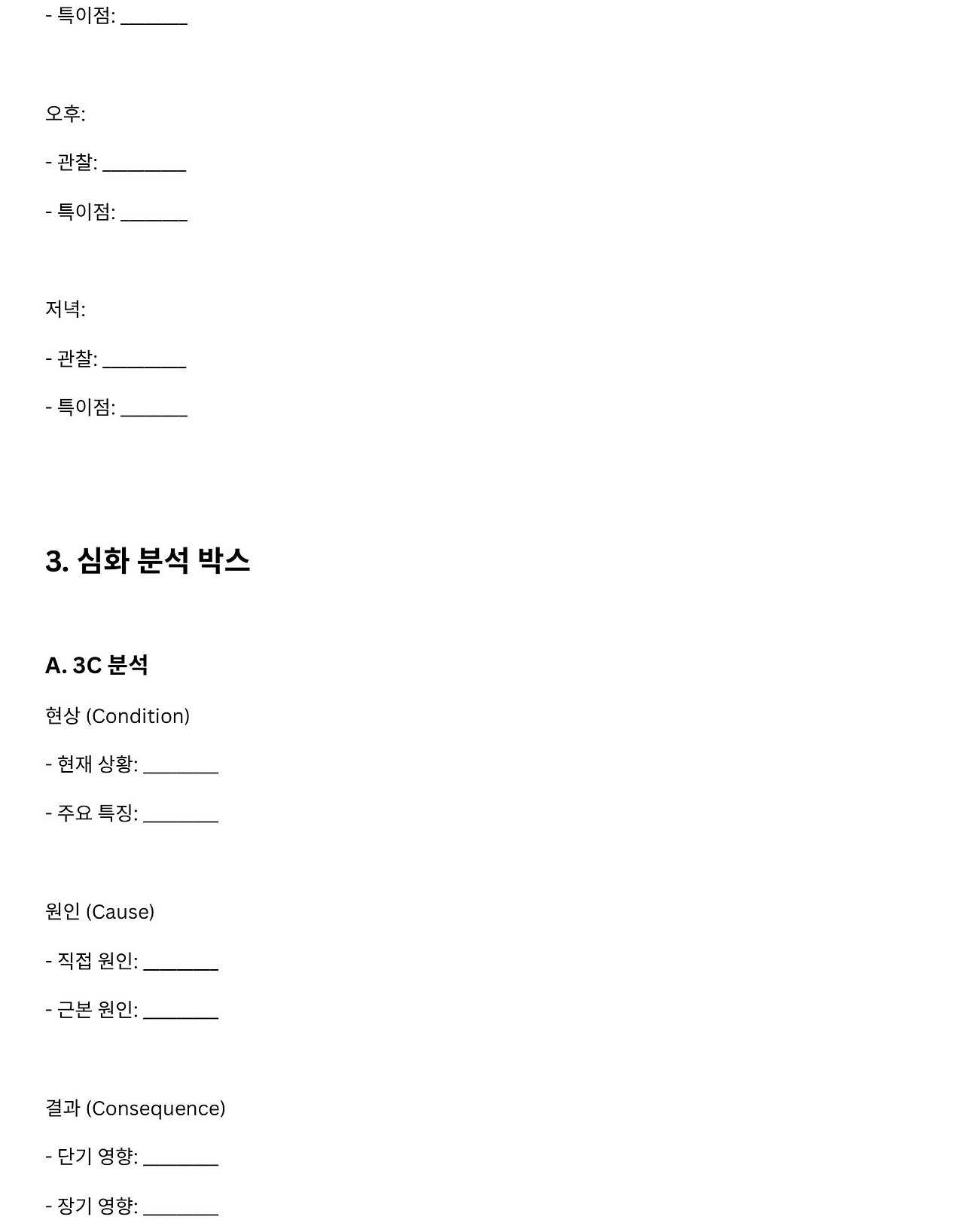 날짜 - 관찰 대상 - 주요 발견사항 - 패턴 - 특이점 - 의문점 - 향후 관찰 - 필요 사항 - 잠정적 가설을 세우며 관찰일지를 작성하면 된다.
