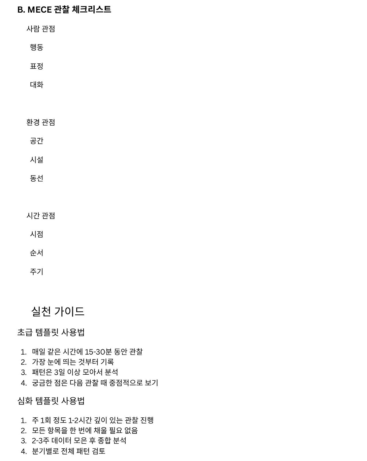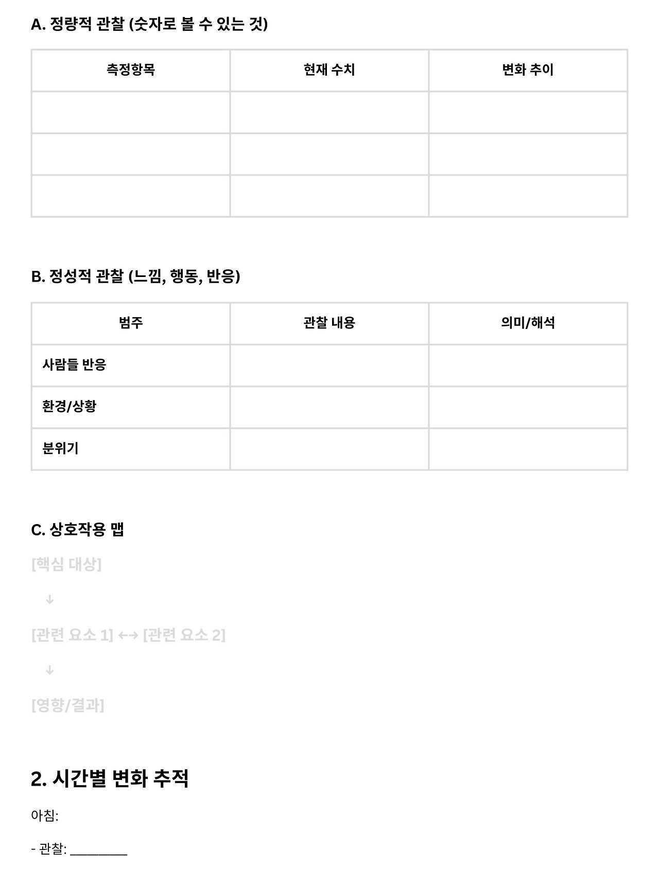 관찰은 본질적 이해를 바탕으로 실제 현상을 체계적으로 파악하는 과정이다. 이는 단순한 '보기'가 아닌, 의미 있는 통찰을 얻기 위한 전략적 활동이라는 걸 잊지 말자. 효과적인 관찰은 성공적인 의사결정과 혁신의 기반이 되어준다.