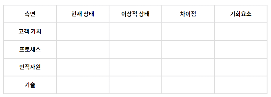 현재 상태, 이상적인 상태, 차이점, 기회요소들을 배열하고 4가지 측면에서 관찰할 수 있다. 고객 가치, 프로세스, 인적자원, 기술 측면으로 구분해 기록한다.