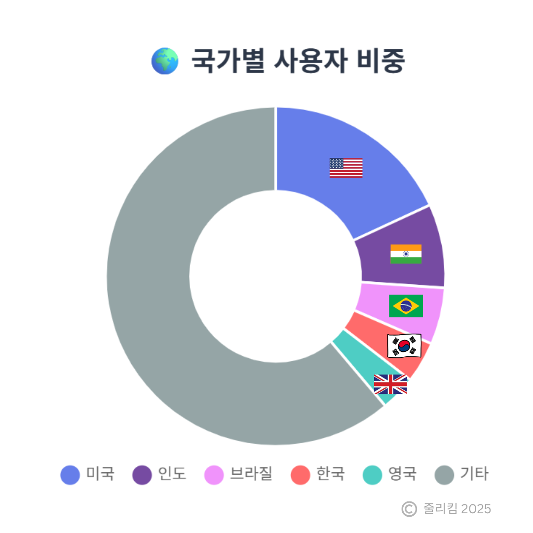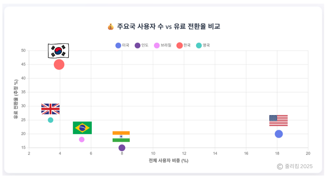 해외 사례들과 비교를 해보면 더욱 흥미로운 결과가 나옵니다. 2025년 기준 유료회원수 세계 2위가 한국이에요. 한국 사용자들이 상당히 적극적으로 유료 서비스를 이용한다는 의미입니다. 한국어 데이터는 ChatGPT 학습 데이터의 0.19%에 불과한 반면 영어 데이터는 92% (출처: ChatGPT 나무위키)인데도 불구하고 높은 사용률과 유료 전환율을 보입니다. 이는 한국 사용자들의 AI 기술에 대한 높은 관심과 적응력을 보여줍니다.