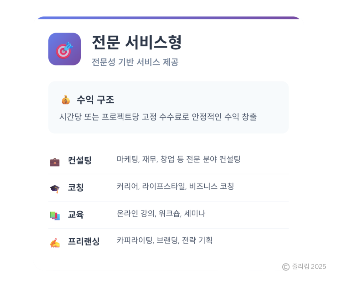 전문 영역이 있거나 전문 영역으로 알려졌으면 한다면 이 유형이 적합합니다. 상품을 제작하는 유형이 아니기에 상품을 제작하고, 생산하고, 유통하는 등의 시간과 노력이 들어가지 않습니다. 한 우물을 파면서 한 영역에서 만큼은 전문가의 능력을 십분 발휘할 수 있습니다. 지금은 전문이 아니더라도 꾸준하게 한 영역을 공부하고, 실행해 가면서 그 프로세스를 공유한다면 사람들은 끌리게 되어있습니다.