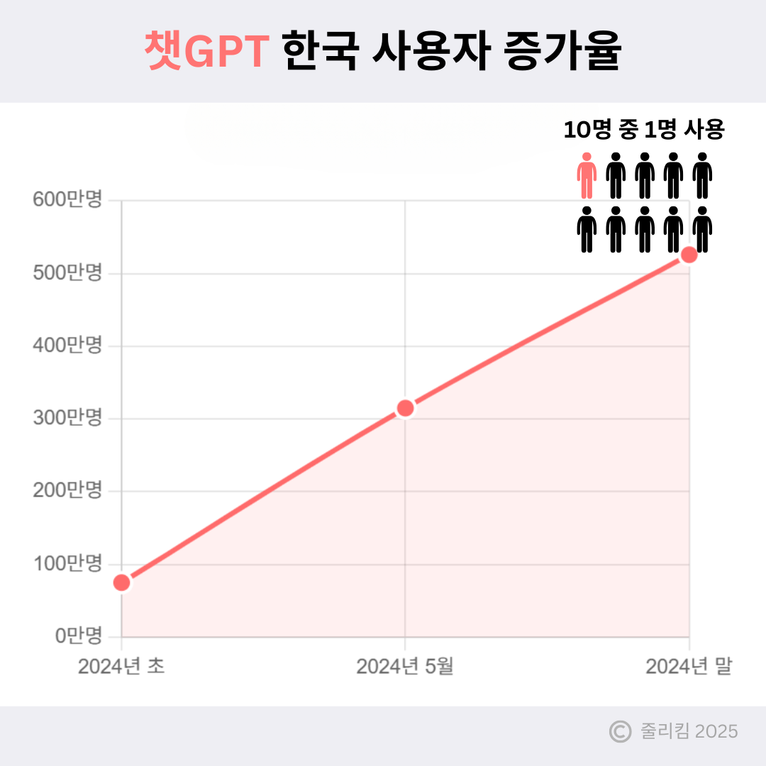 한국 내 ChatGPT 앱 사용자 수는 315만 명에서 526만 명 (2024년 5월 기준)으로 1년 사이 7배 이상 증가했다는 걸 아시나요? 2030 세대가 전체 사용자의 52%를 차지하고 있어요. 한국인 10명 중 1명이 ChatGPT를 사용한다는 겁니다.