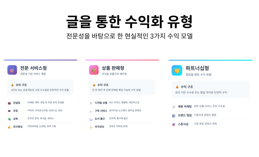 글을 통해서 돈을 벌고 싶다면 '전문 서비스형', '상품 판매형', '파트너십형' 역할 중 하나를 선택해 보세요.