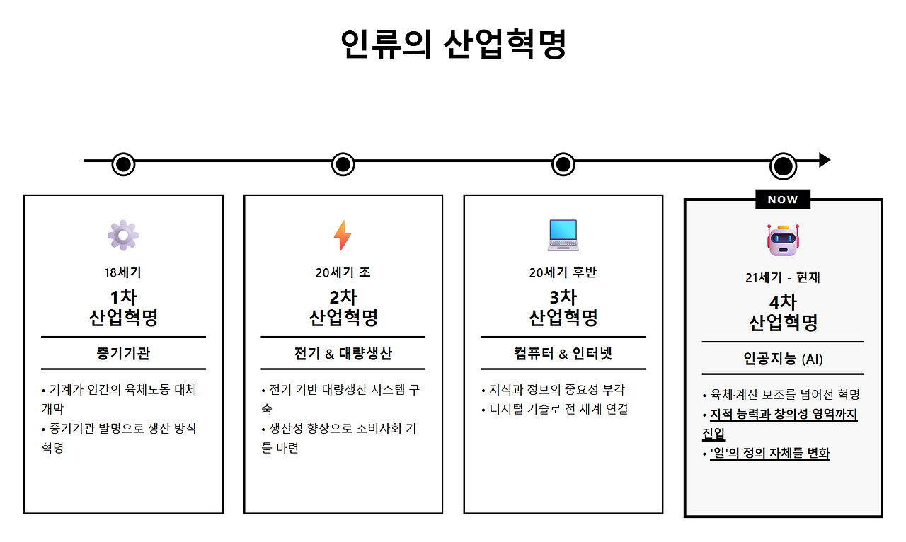 그리고 지금, 우리는 인공지능이 주도하는 4차 산업혁명의 문을 활짝 열었습니다. 이전의 혁명들과 근본적으로 다릅니다. 전에는 기계가 인간의 육체를, 컴퓨터가 인간의 계산 능력을 보조했다면, AI는 인간의 지적 능력과 창의성의 영역까지 파고들며 '일'의 정의 자체를 바꾸고 있습니다.