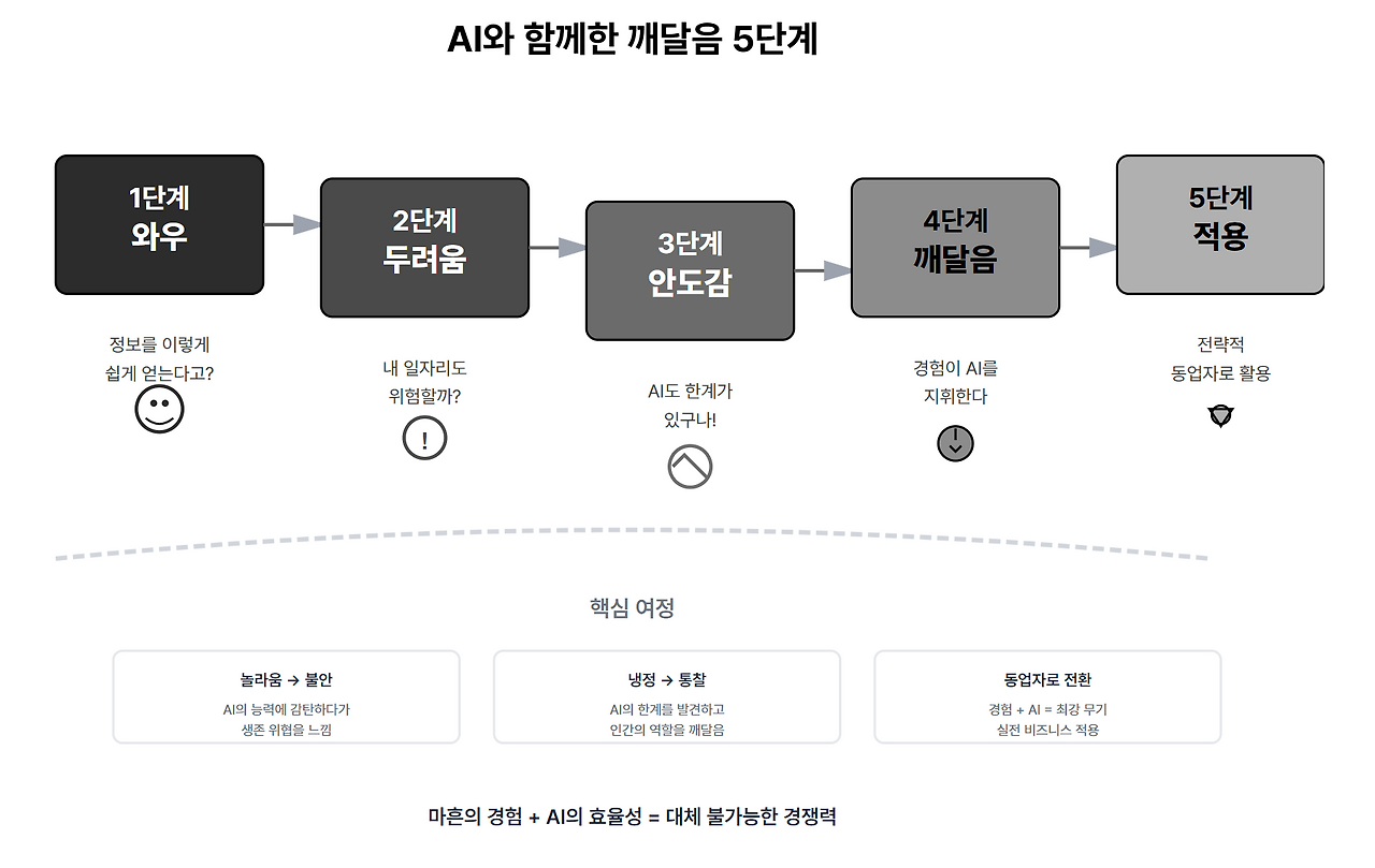 AI가 디자인도 하고, 마케팅 전략도 짜고, 심지어 글도 쓴다면... 경험과 전문성이 무슨 의미가 있을까요? 약 20년간 쌓아온 노하우가 하루아침에 무가치해지는 건 아닐까? 불안해지더라고요. 특히 제 주변의 40-50대 사업가분들도 같은 불안을 토로하셨어요.