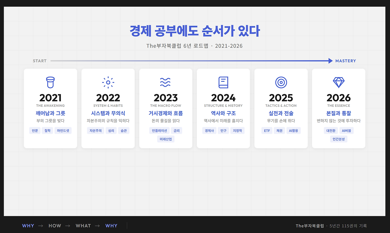 2021년, The부자북클럽을 시작할 때 솔직히 뚜렷한 커리큘럼 같은 건 없었어요. 그저 "경제 공부를 해야 할 것 같다"는 막연한 불안감으로 모였고, "이번 달은 이 책 읽어볼까?" 하며 한, 두 권씩 눈에 들어오는 책들의 제목부터 모으며 골랐을 뿐입니다.