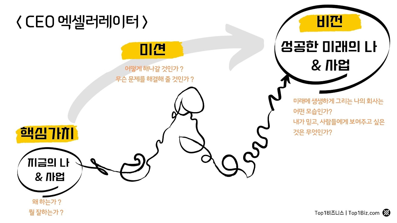핵심가치는 시작점이고, 비전은 미래의 나와 사업의 목표점을 말한다. 미션은 시작점에서 목표점까지 어떻게 도달할 것인지를 의미한다.