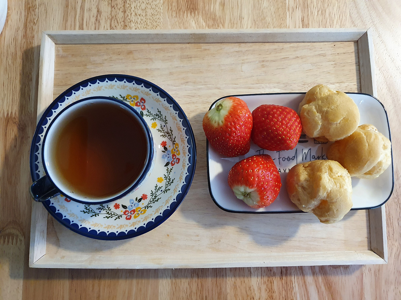 기분을 내려고 홍차랑 슈크림을 더해봤다. 먹고나서 속이 뒤집히는 한이 있더라도, 이렇게 예쁘게 차려먹는 것이 나름 기분전환에 도움이 되었다.