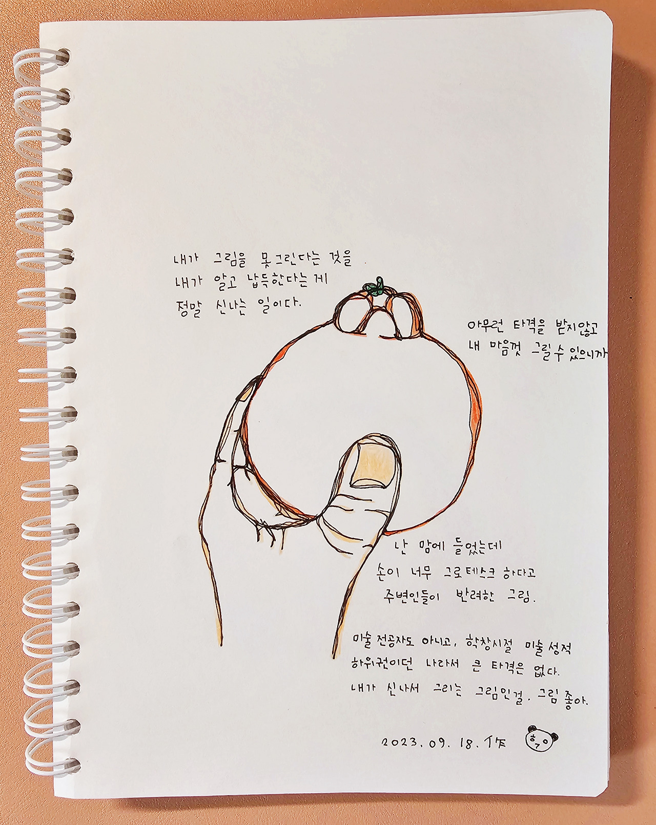 그런 내 모습을 보면서 남편은 뱃속의 아이에게 '뀰'이라는 태명을 붙여주었다. 뱃속의 아이가 듣기 좋게 센 발음으로 해달라는 내 요청과, 제주도 신혼여행에서 우리 둘이 감탄하며 보았던 예쁜 귤밭, 그리고 한라봉과 귤을 끼고 사는 나를 보고 지은 이름이었다. 나는 그 이름이 참 맘에 들었다. 이상한 입덧에 지칠 때면 나는 아이에게 '꿀꿀아' 라고 부르면서 뱃속의 아이를 어르고 달래곤 했다.