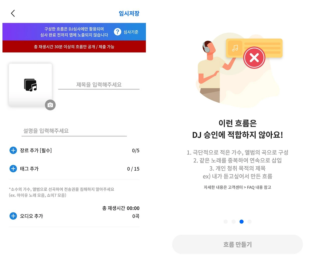 DJ가 흐름을 공유하기 위해서는 심사 과정이 따로 존재한다. <흐름>에 가입해서 플레이리스트 제목, 장르, 태그를 작성하고 흐름을 구성할 오디오를 30분 이상 구성해야 한다. 다음의 조건에 맞지 않으면 DJ로 승인해주지 않는 것 같다. 마지막 조건의 경우, 걸러내기 까다로울 것 같은데 어떤 기준이 있는지 궁금하다.