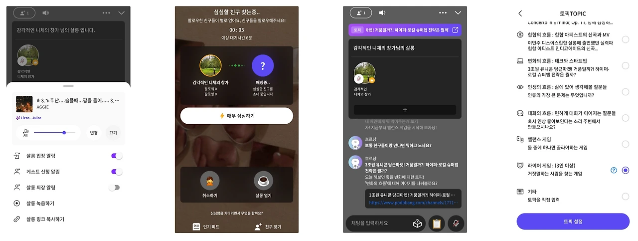 또한 <토픽 TOPIC> 기능을 활용하면 라이브 진행이 어색해지지 않도록 이야깃거리를 제공한다. 최근 IT 이슈, 랜덤 질문, 밸런스 게임, 라이어 게임, 음악 이야기 등 토픽을 선정할 수 있고, 이에 관심 있는 시청자가 방송에 유입할 수 있도록 유도한다.