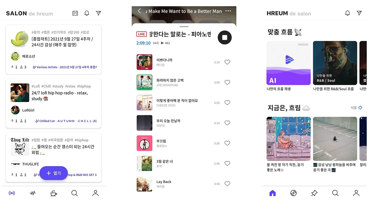 <흐름 드 살롱>의 서비스는 두 가지로 나뉘는 독특한 형태다. <흐름 Hreum>에서는 DJ들이 공유하는 플레이리스트를 들을 수 있다. 음악뿐 아니라 MBC, SBS, KBS 등 방송 3사의 라디오도 들을 수 있다. 선정된 흐름은 단순 플레이리스트가 아니고 DJ의 방송이기 때문에 노래를 변경하거나, 순서를 바꿀 수 없다. 마치 방송을 듣는 것처럼 정해진 노래를 들어야 한다. 만약 따로 노래를 듣고 싶다면 아웃링크로 연결되는 유튜브를 통해 재생할 수 있다. 아마 인앱에서 재생되어야 광고 수익을 배분할 수 있기 때문인 것 같다.