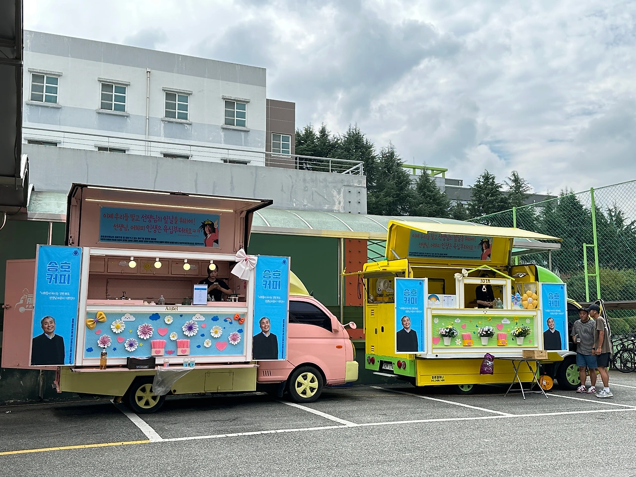 핑크색 차 앞에서 서성이던 동훈이가 우리가 도착한 것을 알아차리고 달려왔다. 그이와 뜨거운 포옹을 하던 동훈이가 말했다. "선생님! 짜잔~ 저희가 커피차를 불렀습니다. 900잔을 마실 수 있는 커피 차니까 영생고 전교생과 선생님들 모두 마셔도 남을 거예요.” 동훈이가 준비한 이벤트는 바로 열열한 팬들이 연예인들에게 보내준다는 커피차였다. 아! 이렇게 그이는 오늘 동훈이 덕분에 스타가 되었다.