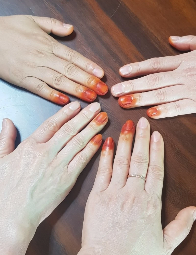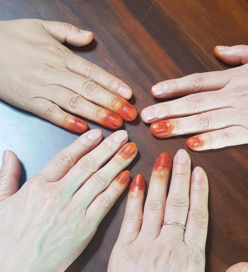 소금기와 백번 탓인지 밤새 손가락이 욱신거리지만 손톱을 더 곱게 물들이기 위해 참아내며 잠을 설친다. 날이 새면 후다닥 동여맨 것을 풀어내고 누구의 손톱이 더 예쁘게 물들었는지 자랑을 하면서 물이 잘 들었다며 좋아하기도 하고 조금 아쉽다고 서운해하기도 한다.