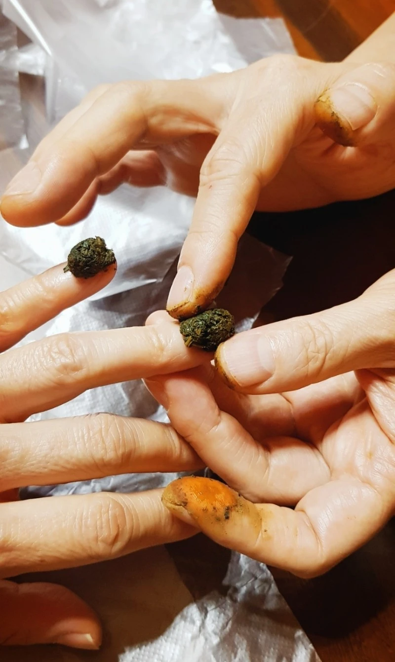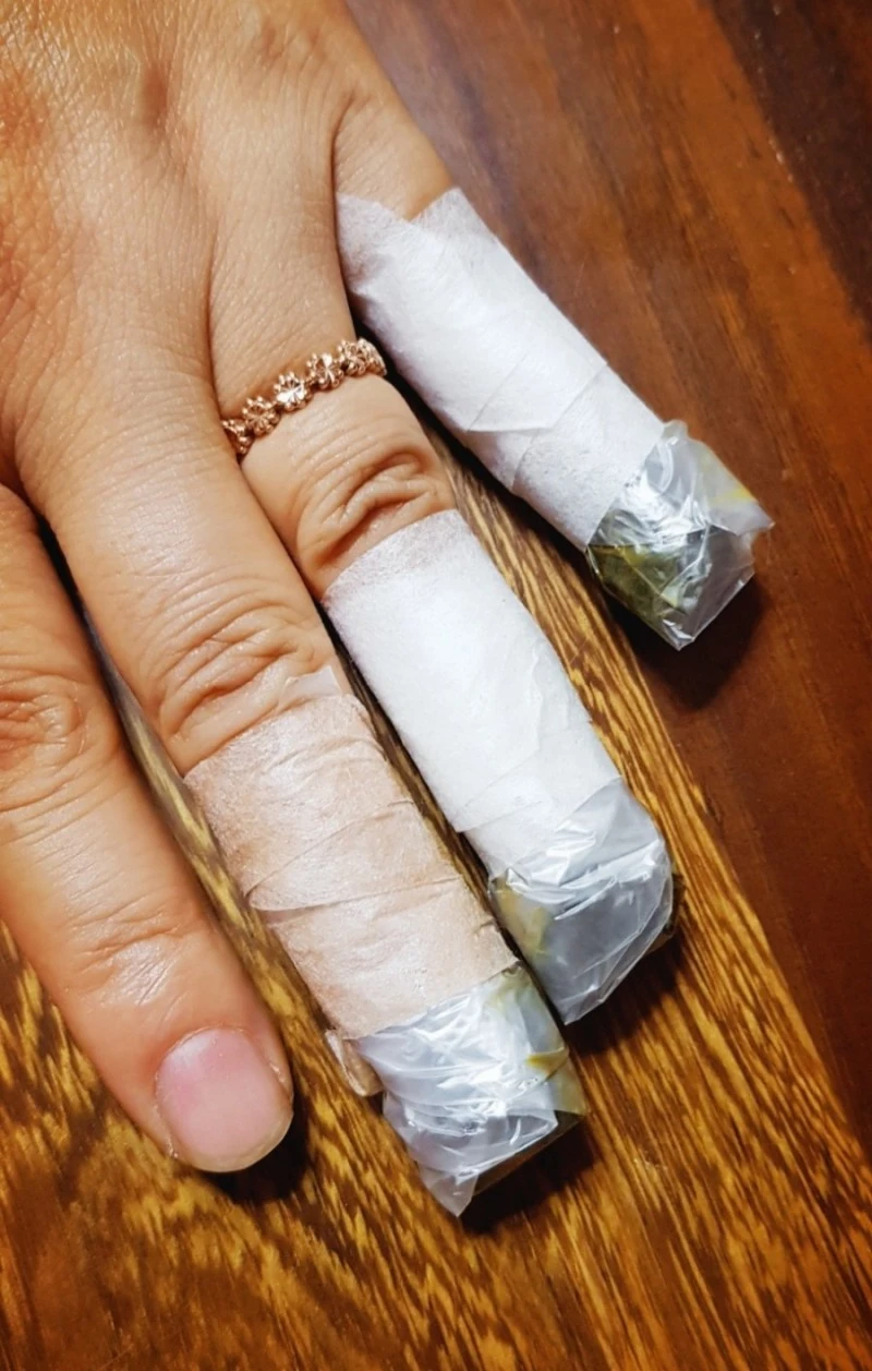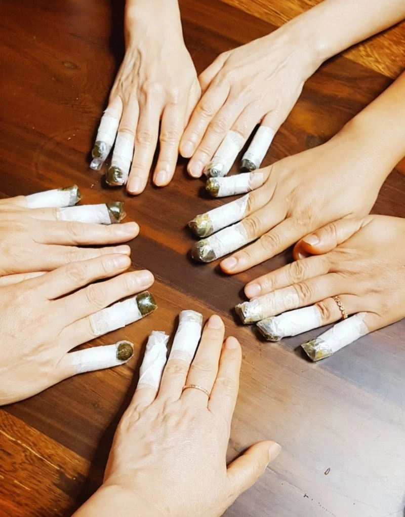 올 해는 막냇동생이 출장 나갔다가 봉숭아(봉선화) 꽃과 잎을 가까스로 구했다고 한다. 봉숭아 물이 손톱에 잘 들게 하려면 잎과 꽃을 따서 줄기를 제거한 후에 삐들삐들해질 때까지 말려야 한다. 시들시들 마른 꽃잎과 꽃에 백번과 소금을 적당히 넣고 절구에 찧는다. 그리고 서로 손가락에 찧은 봉숭아를 얹은 후 비닐로 덮어 반창고로 손가락을 칭칭 동여매 준다.